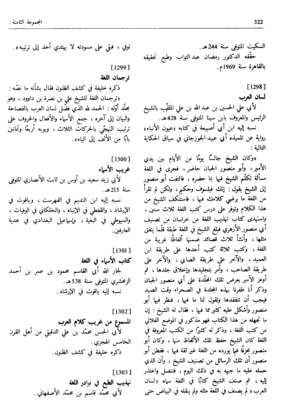 حقّقه الدكتور رمضان عبد التواب وطبع تحقيقه بالقاهرة سنة 1969 م.