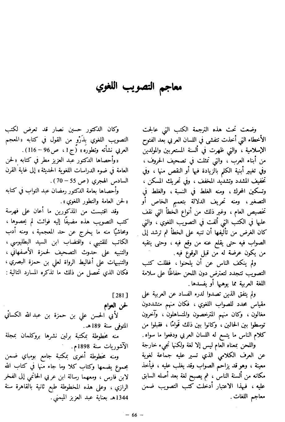 «وأحصاها الدكتور عبد العزيز مطر في كتابه «لحن العامة في ضوء الدراسات اللغوية الحديثة» إلى غاية القرن السادس الهجري (ص 55 - 70).