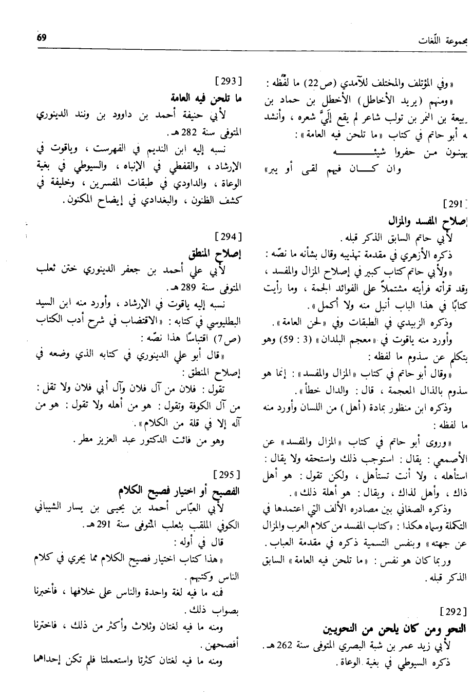 [293] ما تلحن فيه العامة لأبي حنيفة أحمد بن داوود بن ونند الدينوري المتوفى سنة 282 ه.
