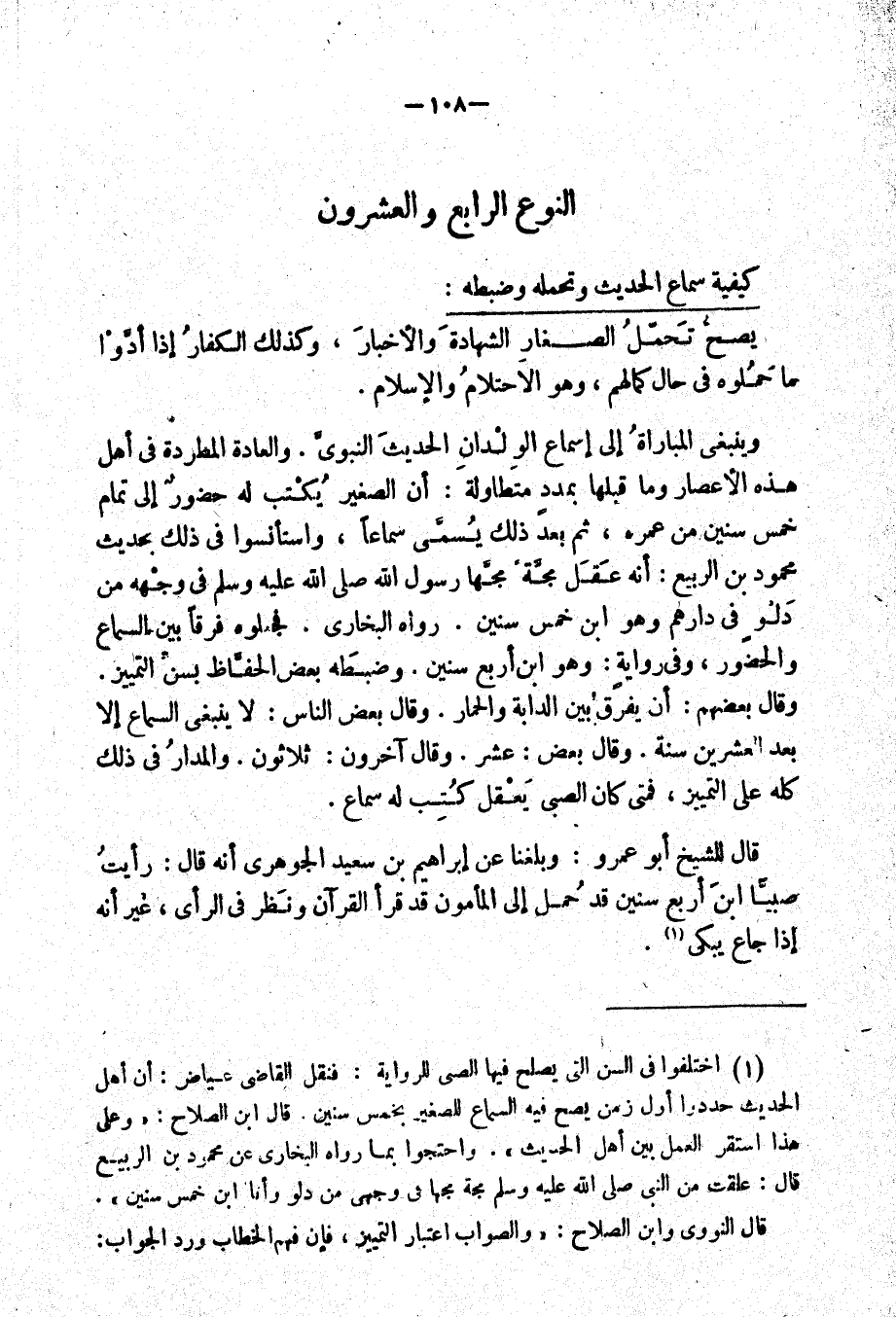 وينبغي المباراة إلى إسماع الولدان الحديث النبوي. والعادة المطردة في أهل عهذه الأعصار وما قبلها بمدد متطاولة: أن الصغير يكتب له حضور إلى تمام خمس سنين من عمره، ثم بعد ذلك يسمى سماعاً، واستأنسوا في ذلك بحديث محمود بن الربيع: أنه عقل مجَّة مجَّها رسول الله صلى الله عليه وسلم في وجهه من دلو في دارهم وهو ابن خمس سنين. ورواه البخاري. فجعلوه فرقاً بين السماع والحضور، وفي رواية: وهو ابن أربع سنين. وضبطه بعض الحفاظ بسن التمييز. وقال بعضهم: أن يفرق بين الدابة والحمار. وقال بعض الناس: لا ينبغي السماع إلا بعد العشرين سنة. وقال بعض: عشر. وقال آخرون: ثلاثون. والمدار في ذلك كله على التمييز، فمتى كان الصبي يعقل كتب له سماع.