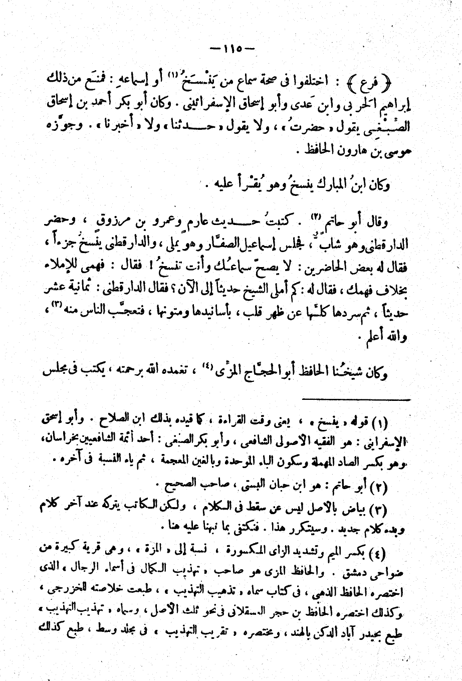 " فرع ": اختلفوا في صحة سماع من ينسخ أو إسماعه: فمنع من ذلك إبراهيم الحربي وابن عدي وأبو إسحاق الأسفرائيني. وكان أبو بكر أحمد بن إسحاق الصبغي يقول " حضرت "، ولا يقول " حدثنا " ولا " أخبرنا ". وجوزه موسى بن هارون الحافظ.