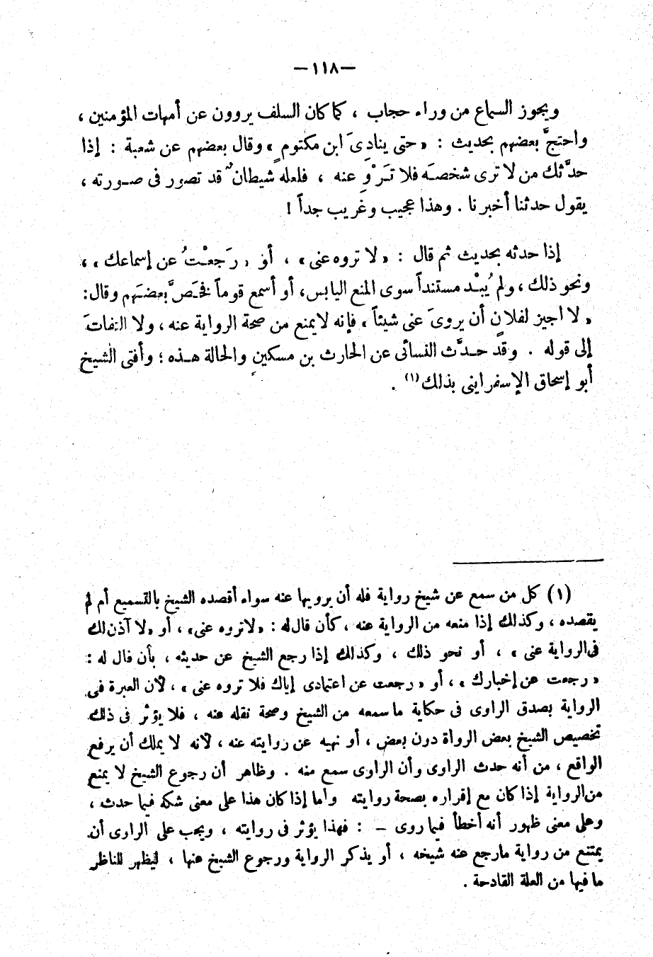 وقال بعضهم عن شعبة: إذا حدثك من لا ترى شخصه فلا ترو عنه، فلعله شيطان قد تصور في صورته، يقول حدثنا أخبرنا. وهذا عجيب وغريب جداً! إذا حدثه بحديث ثم قال: " لا تروه عني "، أو " رجعت عن إسماعك "، ونحو ذلك، ولم يبد مستنداً سوى المنع اليابس، أو أسمع قوماً فخص بعضهم وقال: " لا أجيز لفلان أن يروي عني شيئا " فإنه لا يمنع من صحة الرواية عنه، ولا التفات إلى قوله. وقد حدث النسائي عن الحارث بن مسكين والحالة هذه؛ وأفتى الشيخ أبو إسحاق الأسفرائيني بذلك.