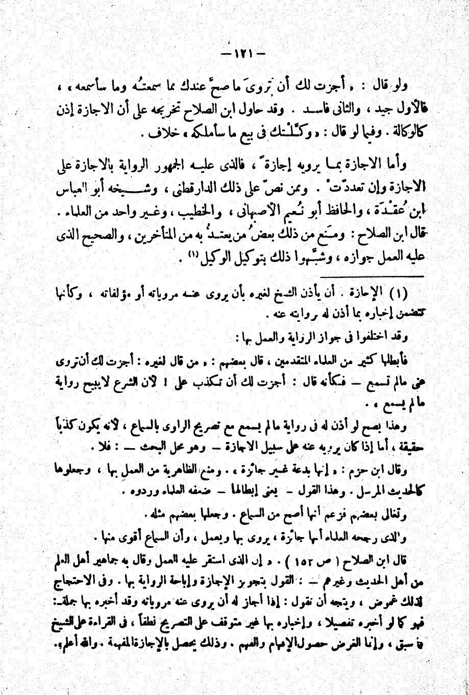 وأما الإجازة بما يرويه إجازة، فالذي عليه الجمهور الرواية بالإجازة على الإجازة وإن تعددت. وممن نص على ذلك الدارقطني، وشيخه أبو العباس ابن عقدة، والحافظ أبو نعيم الأصبهاني، والخطيب، وغير واحد من العلماء. قال ابن الصلاح: ومنع من ذلك بعض من لا يعتمد به من المتأخرين، والصحيح الذي عليه العمل جوازه، وشهوا ذلك بتوكيل الوكيل.