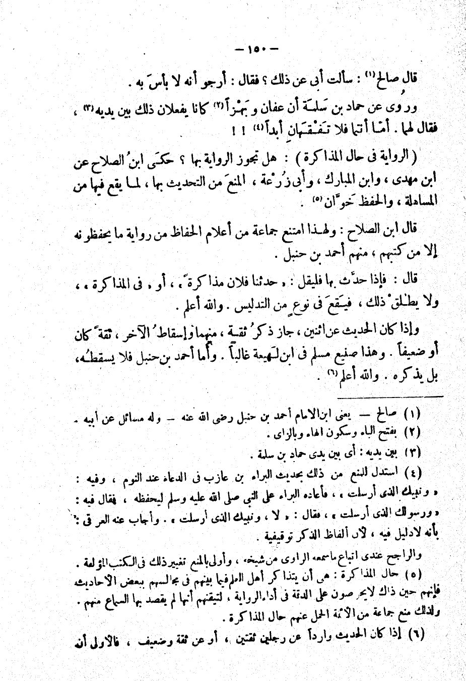 وروي عن حماد بن سلمة أن عفان وبهزاً كانا يفعلان ذلك بين يديه، فقال لهما: أما أنتما فلا تفقهان أبداً!! " الرواية في حال المذاكرة ": هل تجوز الرواية بها؟ حكى ابن الصلاح عن ابن مهدي، وابن المبارك، وأبي زرعة، المنع من التحديث بها، لما يقع فيها من المساهلة، والحفظ خوَّان.