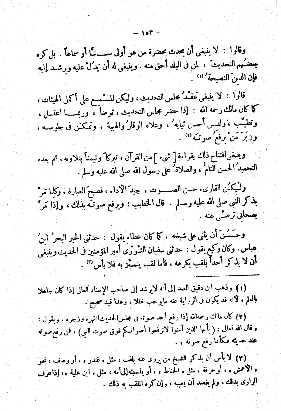 قالوا: لا ينبغي عقد مجلس التحديث، وليكن المسمع على أكمل الهيئات، كما كان مالك رحمه الله: إذا حضر مجلس التحديث، توضأ، وربما اغتسل، وتطيب، ولبس أحسن ثيابه، وعلاه الوقار والهيبة، وتمكن في جلوسه، وزَبرَ من يرفع صوته.