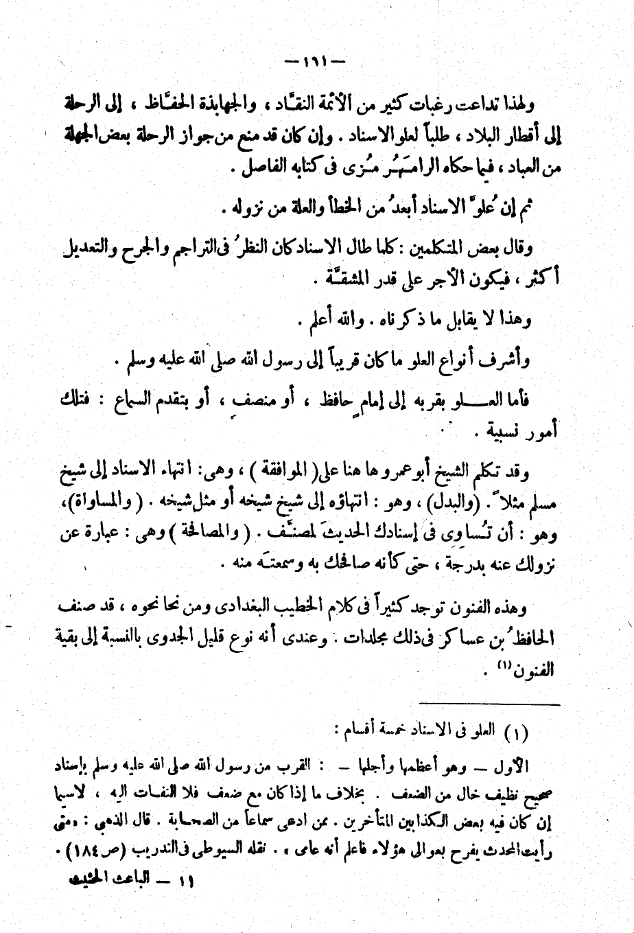 ولهذا تداعت رغبات كثير من الأئمة النقاد، والجهابذة الحفاظ، إلى الرحلة إلى أقطاب البلاد، طلباً لعلو الإسناد. وإن كان قد منع من جواز الرحلة بعض الجهلة من العباد، فيما حكاه الرامهُرمُزي في كتابه الفاصل.