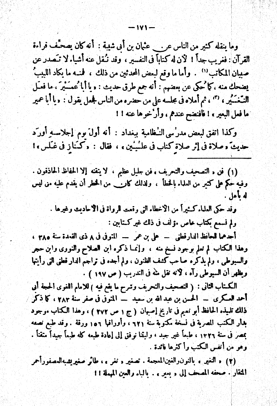وما ينقله كثير من الناس عن عثمان بن أبي شيبة: أ، هـ كان يصحف قراءة القرآن: فغريب جداً! لأن له كتاباً في التفسير، وقد نقل عنه أشياء لا تصدر عن صبيان المكاتب. وأما ما وقع لبعض المحدثين من ذلك، فمنه ما يكاد اللبيب يضحك منه، كما حكي عن بعضهم: أنه جمع طرق حديث: " يا أبا عمير، ما فعل النفير "، ثم أملاه في مجلسه على من حضره من الناس فجعل يقول: " يا أبا عمير ما فعل البعير "! فافتضح عندهم، وأرَّخوها عنه!! وكذا اتفق لبعض مدرسي النظامية ببغداد: أنه أو ل يوم إجلاسه أورد حديث " صلاة في إثر صلاة كتاب في عليين "، فقال: " كناز في غلس "!