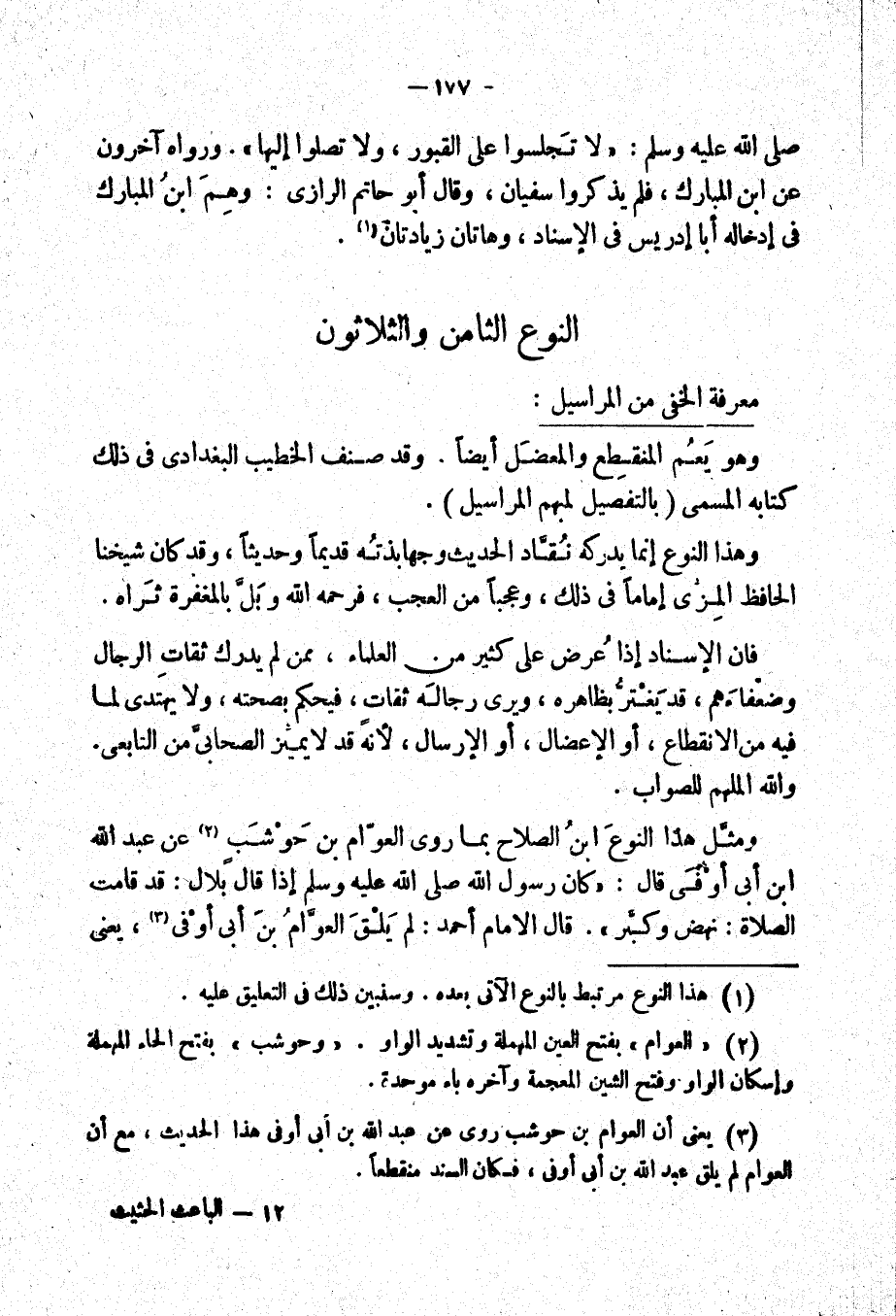 ومثَّل هذا النوع ابن الصلاح بما روى العوَّام بن حوشب عن عبد الله ابن أبي أوفى قال: كان رسول الله صلى الله عليه وسلم إذا قال بلال: قد قامت الصلاة: نهض وكبر " قال الإمام أحمد: لم يلق العوام ابن أبي أوفى، يعني