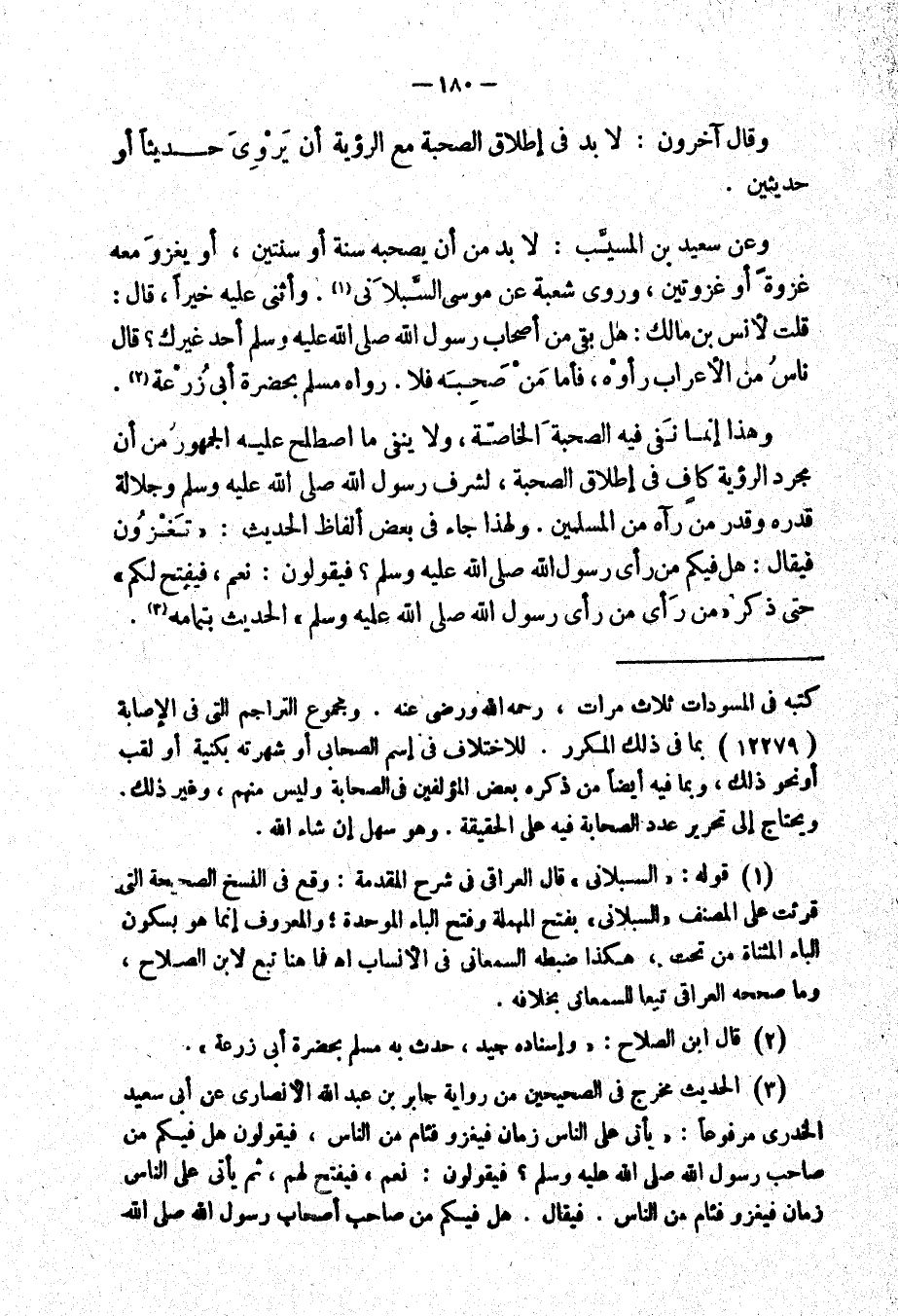 وعن سعيد بن المسيب: لا بد من أن يصحبه سنة أو سنتين، أو يغزو معه غزوة وغزوتين. وروى شعبة عن موسى السبلاني. وأثنى عليه خيراً، قال: قلت لأنس بن مالك: هل بقي من أصحاب رسول الله صلى الله عليه وسلم أحد غيرك؟ قال ناس من الأعراب رأوه، فأما من صحبه فلا. رواه مسلم بحضرة أبي زرعة.