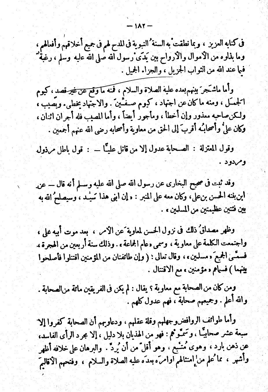 وأما ما شجر بينهم بعده عليه الصلاة والسلام، فمنه ما وقع عن غير قصد، كيوم الجمل، ومنه ما كان عن اجتهاد، كيوم صفين. والاجتهار يخطئ ويصيب، ولكن صاحبه معذور وإن أخطأ، ومأجور أيضاً، وأما المصيب فله أجران اثنان، وكان علي وأصحابه أقرب إلى الحق من معاوية وأصحابه رضي الله عنهم أجمعين.