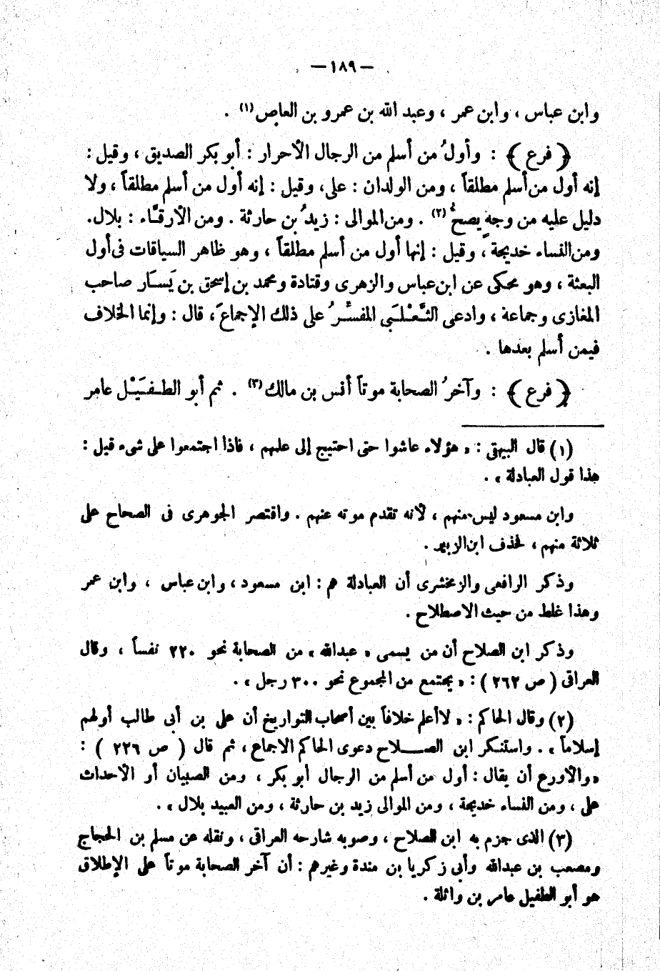 " فرع ": وأول من أسلم من الرجال الأحرار: أبو بكر الصديق، وقيل: إنه أول من أسلم مطلقاً. ومن الولدان: علي، وقيل: إنه أول من أسلم مطلقاً، ولا دليل عليه من وجه يصح. ومن الموالي: زيد بن حارثة. ومن الأرقاء: بلال. ومن النساء: خديجة، وقيل: إنها أول من أسلم مطلقاً، وهو ظاهر السياقات في أول البعثة، وهو محكي عن ابن عباس والزهري وقتادة ومحمد بن إسحق بن يسار صاحب المغازي وجماعة، وادعى الثعلبي المفسر على ذلك الإجماع قال: وإنما الخلاف فيمن أسلم بعدها.