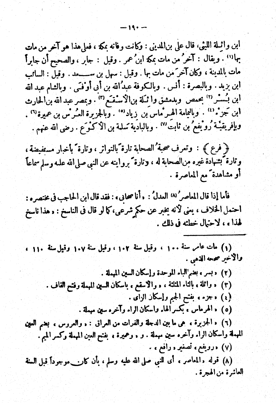 " فرع ": وتعرف صحبة الصحابة تارة بالتواتر، وتارة بأخبار مستفيضة، وتارة بشهادة غيره من الصحابة له، وتارة بروايته عن النبي صلى الله عليه وسلم سماعاً أو مشاهدة مع المعاصرة.
