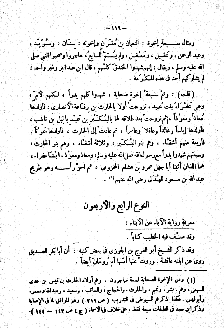 ومثال سبعة أخوة: النعمان بن مقرن وأخوته: سنان، وسويد، وعبد الرحمن، وعقيل، ومعقل، ولم يسم السابع، هاجروا وصحبوا النبي صلى الله عليه وسلم، ويقال: إنهم شهدوا الخندق كلهم، قال ابن عبد البر وغير واحد: لم يشاركهم أحد في هذه المكرمة.