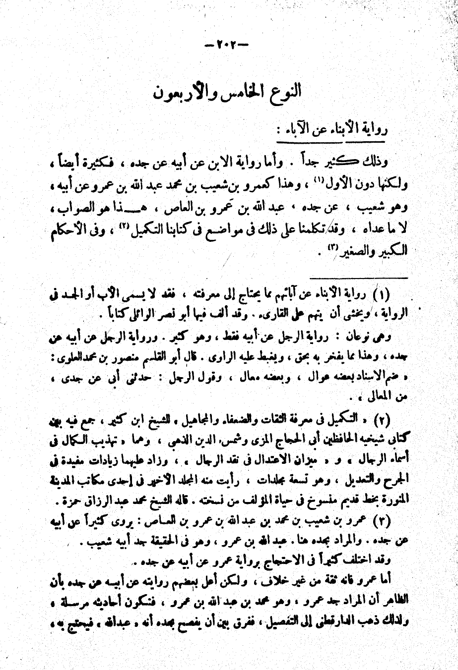 وذلك كثير جداً. وأما رواية الابن عن أبيه عن جده، فكثيرة أيضاً، ولكنها دون الأول، وهذا كعمرو بن شعيب بن محمد عبد الله ابن عمرو عن أبيه، وهو شعيب، عن جده، عبد الله بن عمرو بن العاص، هذا هو الصواب، لا ما عداه، وقد تكلمنا على ذلك في مواضع في كتابنا التكميل، وفي الأحكام الكبير والصغير.