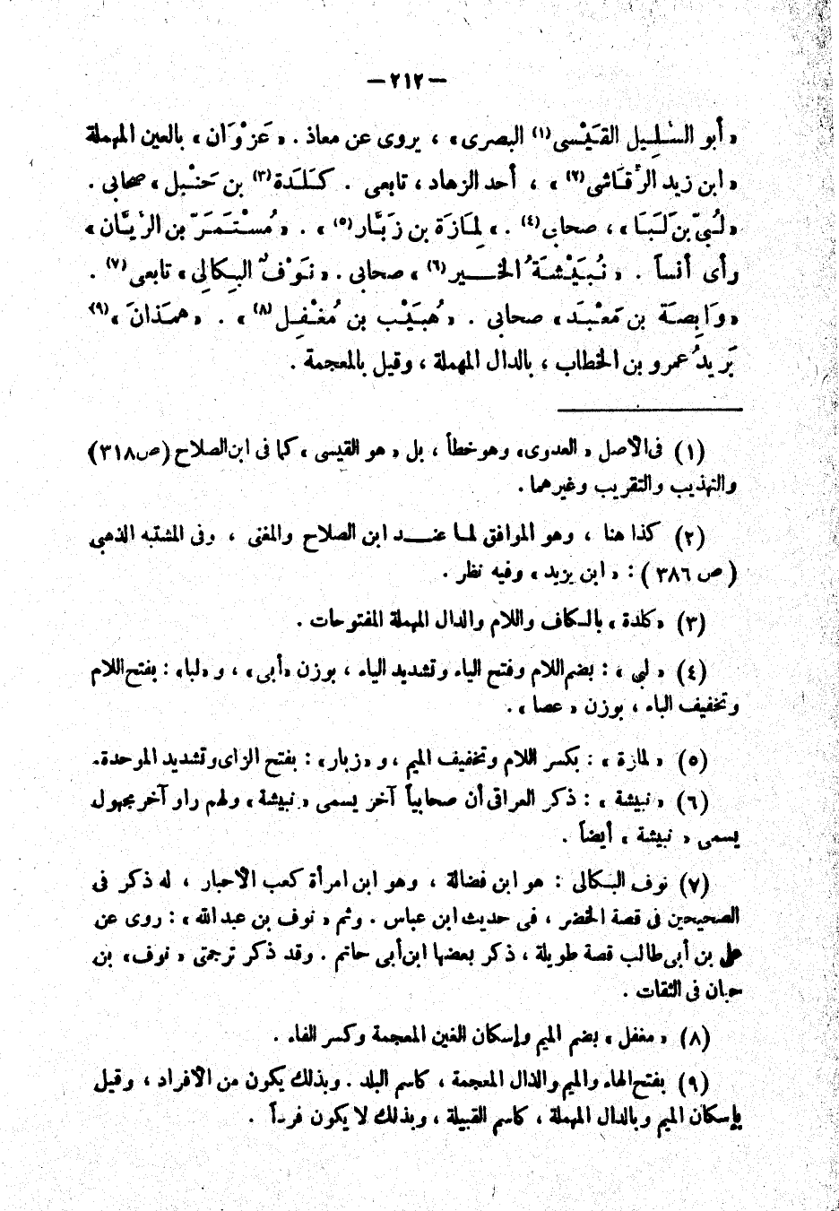 " أبو السليل القيسي البصري "، يروي عن معاذ. " عَزوان " بالعين المهملة " ابن السَّليل القيسي الرقاشي "، أحد الزهاد، تابعي. " كلدة بن حنبل " صحابي. " لُبي بن لبا " صحابي. " لملزة بن زبار ". " مُستمر بن الريان "، رأى أنساً. " نُبيشة الخير " صحابي. " نوف البِكالي " تابعي. " وابِصة بن معبد " صحابي. " حبيب بن مغفل ". " همذان " بريد عمر بن الخطاب، بالدال المهملة، وقيل بالمعجمة.