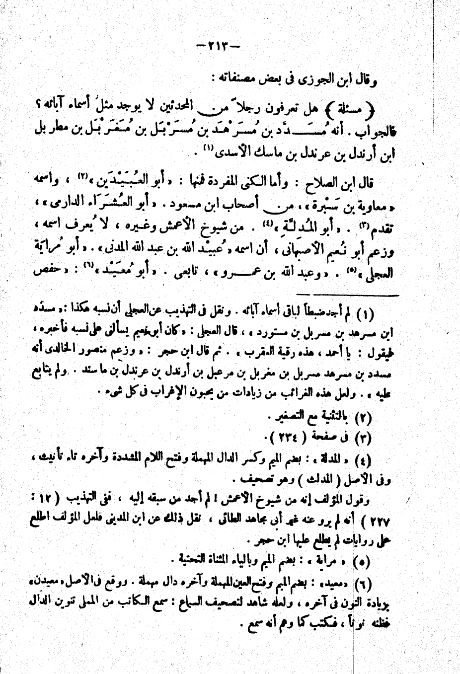 وقال ابن الجوزي في بعض مصنفاته: " مسئلة " هل تعرفون رجلاً من المحدثين لا يوجد مثل أسماء آبائه؟ فالجواب: أنه مُسَدَّد بن مُسرْهد بن مُسربل بن مُغربل ابن مُطربل بن أرندل بن عرندل بن ماسك الأسدي.