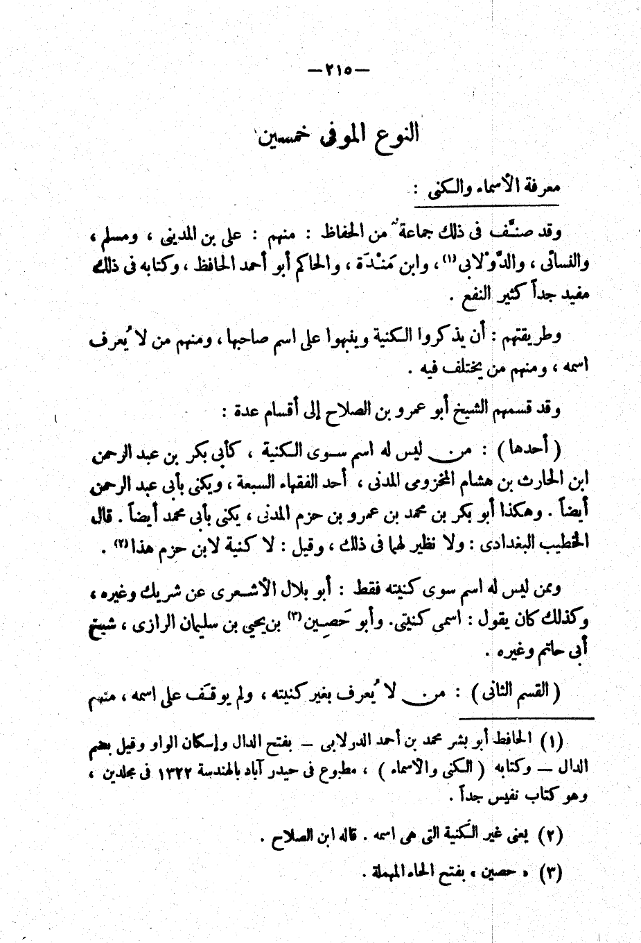 وقد قسمهم الشيخ أبو عمرو بن الصلاح إلى أقسام عدة: " أحدها ": من ليس له اسم سوى الكنية، كأبي بكر بن عبد الرحمن بن الحارث بن هشام المخزومي المدني، أحد الفقهاء السبعة، ويكنى بأبي عبد الرحمن أيضاً. وهكذا أبو بكر بن محمد بن عمرو بن حزم المدني، يكنى بأبي محمد أيضاً. قال الخطيب البغدادي: ولا نظير لهما في ذلك، وقيل: لا كنية لابن حزم هذا.