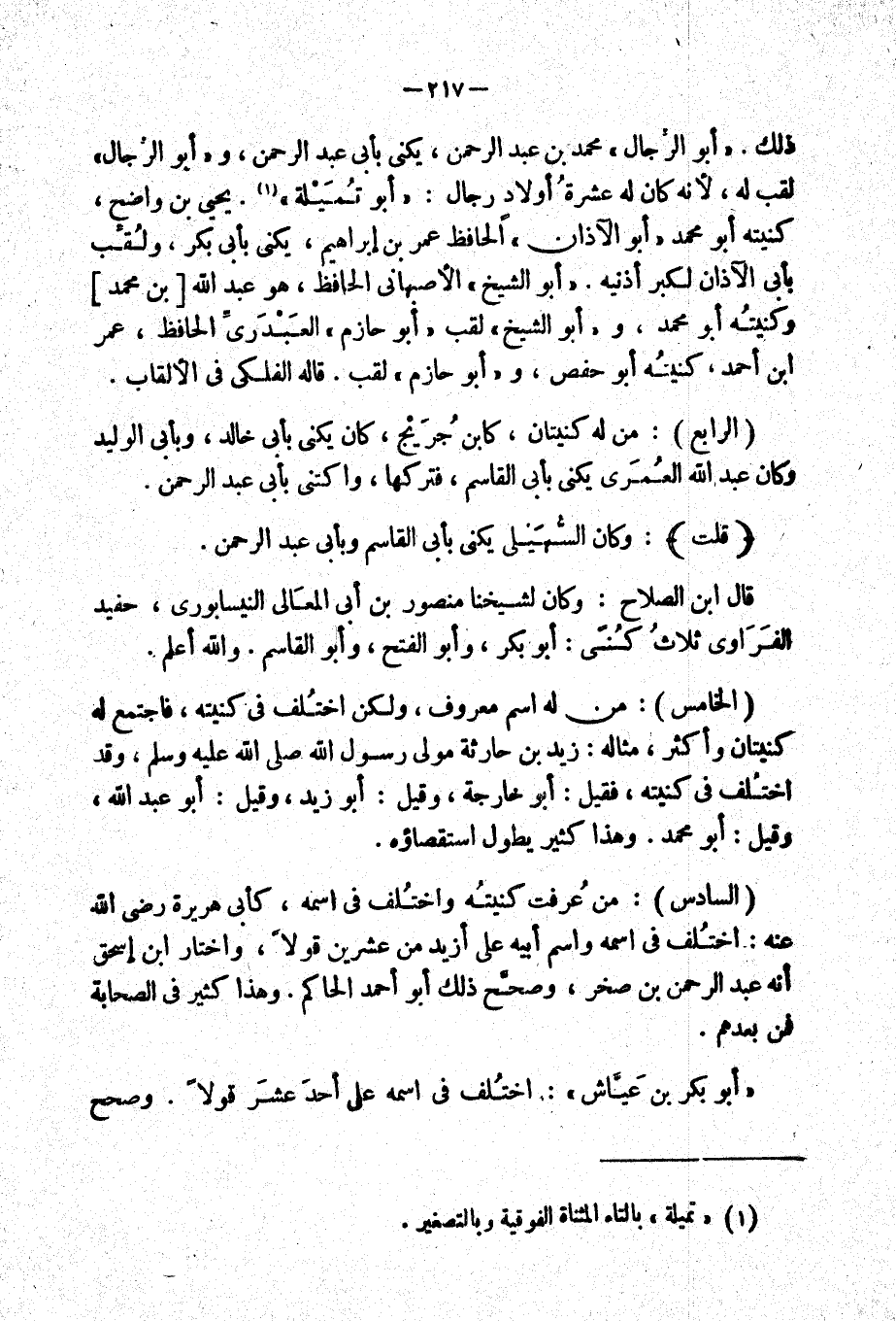 " الخامس ": من له اسم معروف، ولكن اختلف في كنيته، فاجتمع له كنيتان وأكثر، مثاله: زيد بن حارثة مولى رسول الله صلى الله عليه وسلم، وقد اختلف في كنيته، فقيل: أبو خارجة، وقيل: أبو زيد، وقيل: أبو عبد الله، وقيل: أبو محمد. وهذا كثير يطول استقصاؤه.