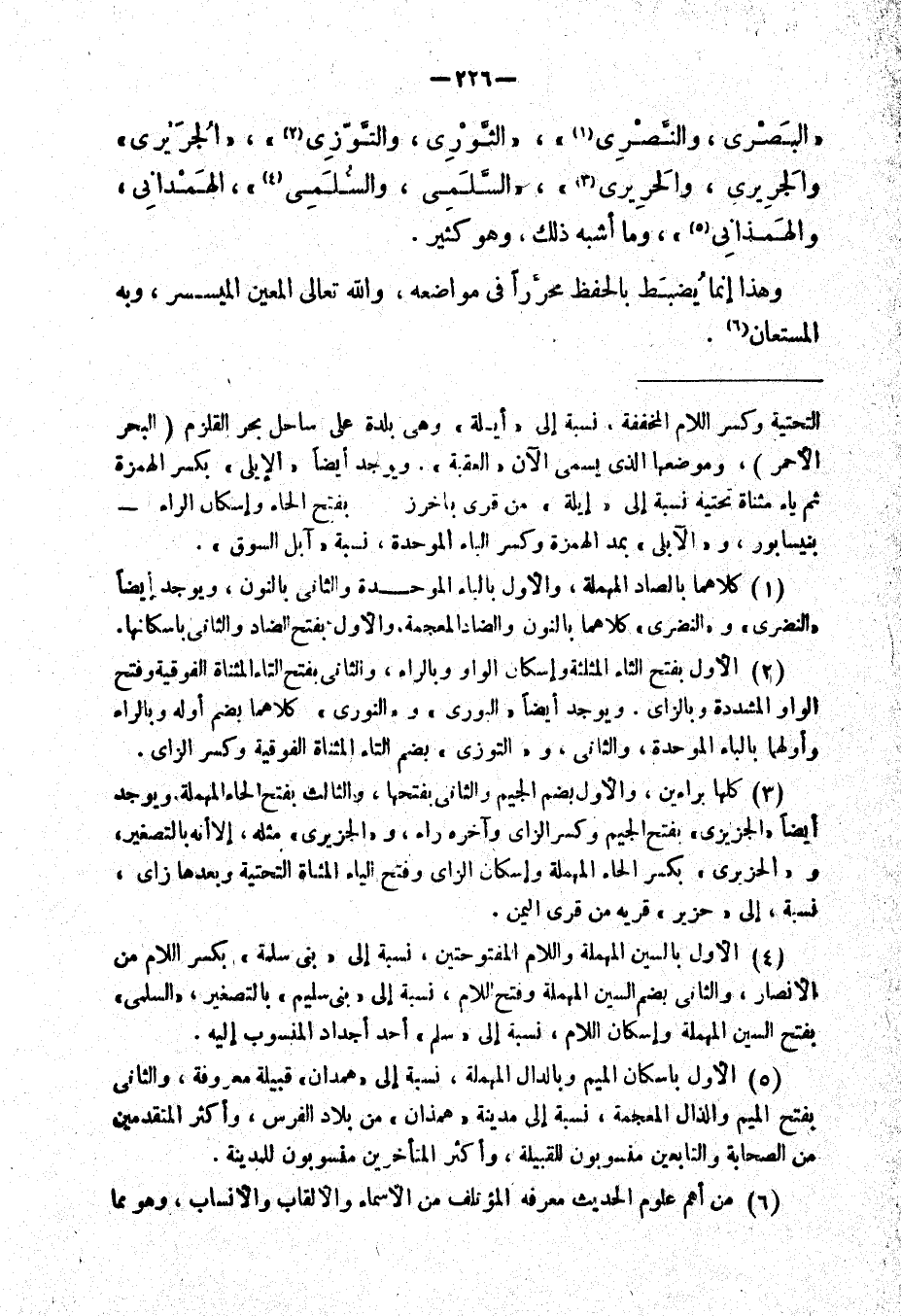 " البصري والنصري "، " الثوري والتوز "، " الجُريري، والجَريري، والحريري "، " السَّلمي، والسُّلمي "، " الهمداني، والهمذاني "، وما أشبه ذلك، وهو كثير.