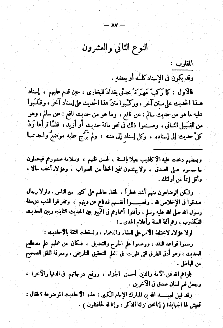 فالأول: كما ركب مهرة محدثي بغداد للبخاري، حين قدم عليهم، إسناد هذا الحديث على متن آخر، وركبوا متن هذا الحديث على إسناد آخر، وقلبوا عليه ما هو من حديث سالم: عن نافع، وما هو من حديث نافع: عن سالم وهو من القبيل الثاني، وصنعوا ذلك في نحو مائة حديث او أزيد، فلما قرأها رد كل حديث إلى إسناده، وكل إسناد إلى متنه، ولم يرُج عليه موضع واحد مما