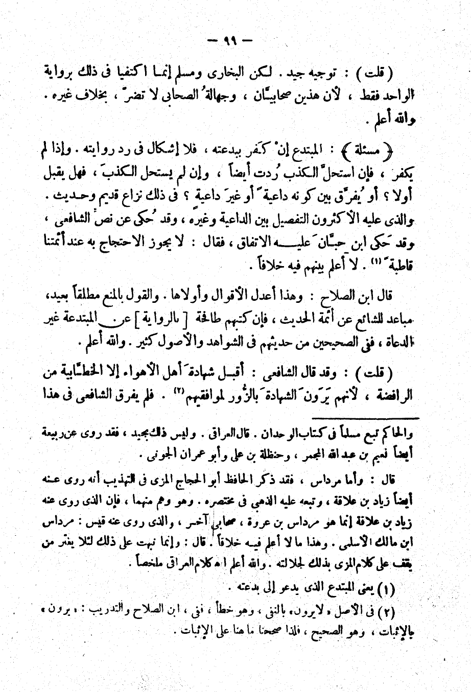 " مسئلة ": المبتدع إن كفر ببدعته، فلا إشكال في رد روايته. وإذا لم يكفر، فإن استحل الكذب رُدت أيضاً، وإن لم يستحل الكذب، فهل يقبل أو لا؟ أو يفرق بين كونه داعية أو غير داعية؟ في ذلك نزاع قديم وحديث. والذي عليه الأكثرون التفصيل بين الداعية وغيره، وقد حكي عن نص الشافعي، وقد حكى ابن حبان عليه الاتفاق، فقال: لا يجوز الاحتجاج به عند أئمتنا قاطبة، لا أعلم بينهم فيه خلافاً.