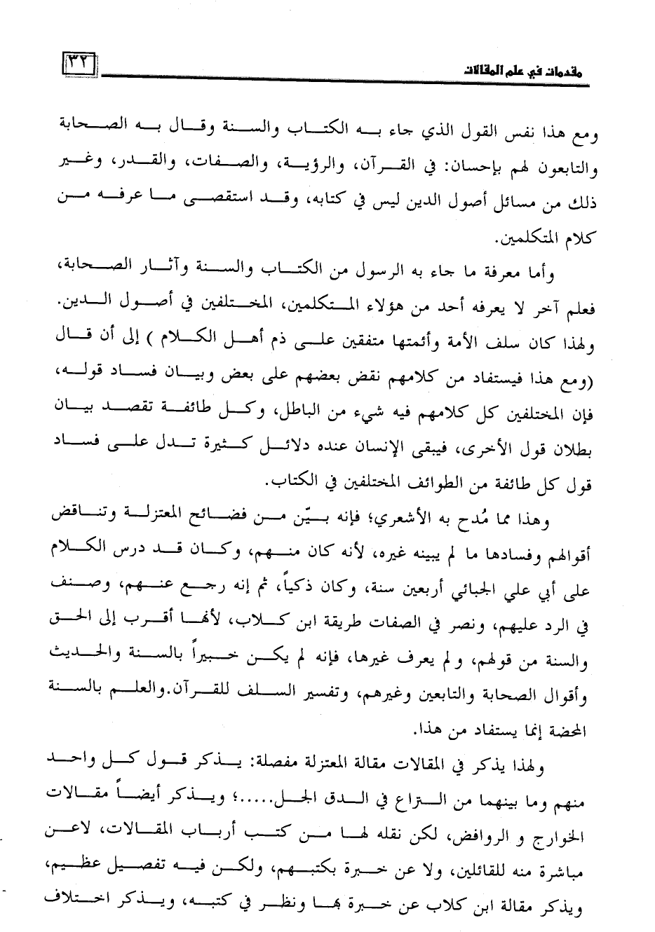 وهذا مما مُدح به الأشعري؛ فإنه بيّن من فضائح المعتزلة وتناقض أقوالهم وفسادها ما لم يبينه غيره، لأنه كان منهم، وكان قد درس الكلام على أبي علي الجبائي أربعين سنة، وكان ذكياً، ثم إنه رجع عنهم، وصنف في الرد عليهم، ونصر في الصفات طريقة ابن كلاب، لأنها أقرب إلى الحق والسنة من قولهم، ولم يعرف غيرها، فإنه لم يكن خبيراً بالسنة والحديث وأقوال الصحابة والتابعين وغيرهم، وتفسير السلف للقرآن. والعلم بالسنة المحضة إنما يستفاد من هذا.