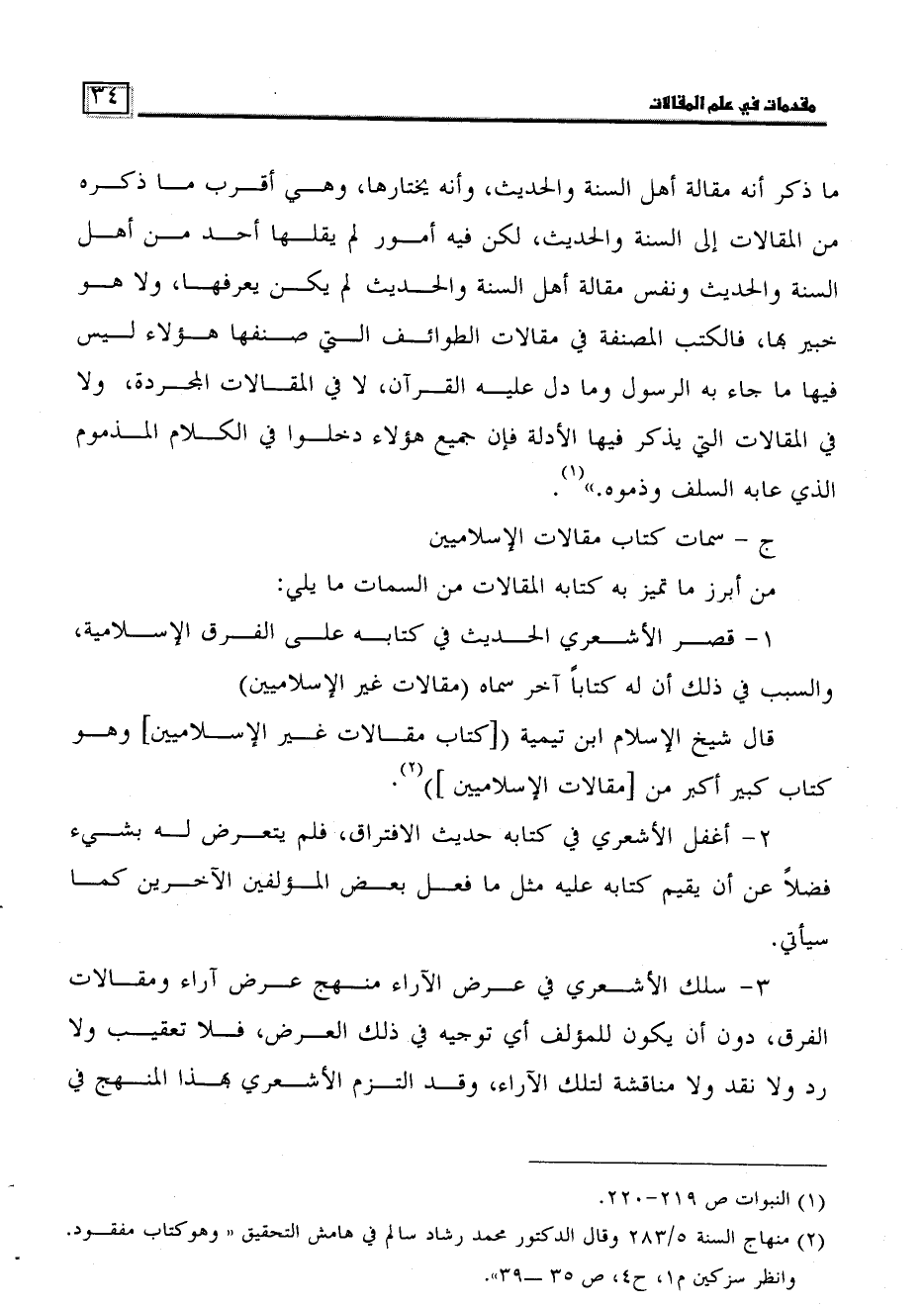 ما ذكر أنه مقالة أهل السنة والحديث، وأنه يختارها، وهي أقرب ما ذكره من المقالات إلى السنة والحديث، لكن فيه أمور لم يقلها أحد من أهل السنة والحديث ونفس مقالة أهل السنة والحديث لم يكن يعرفها، ولا هو خبير بها، فالكتب المصنفة في مقالات الطوائف التي صنفها هؤلاء ليس فيها ما جاء به الرسول وما دل عليه القرآن، لا في المقالات المجردة، ولا في المقالات التي يذكر فيها الأدلة فإن جميع هؤلاء دخلوا في الكلام المذموم الذي عابه السلف وذموه"1