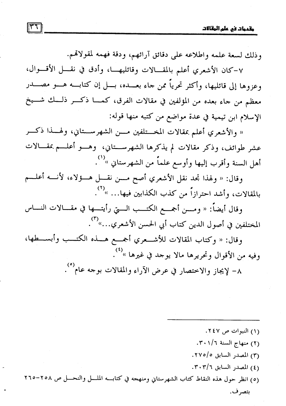 "والأشعري أعلم بمقالات المختلفين من الشهرستاني، ولهذا ذكر عشر طوائف، وذكر مقالات لم يذكرها الشهرستاني، وهو أعلم بمقالات أهل السنة وأقرب إليها وأوسع علماً من الشهرستاني"1.