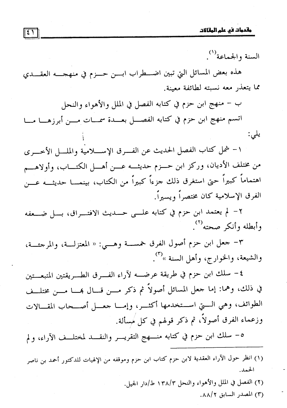 4-سلك ابن حزم في طريقة عرضه لآراء الفرق الطريقتين المتبعتين في ذلك، وهما: إما جعل المسائل أصولاً ثم ذكر من قال بها من مختلف الطوائف، وهي التي استخدمها أكثر، وإما جعل أصحاب المقالات وزعماء الفرق أصولاً، ثم ذكر قولهم في كل مسألة.