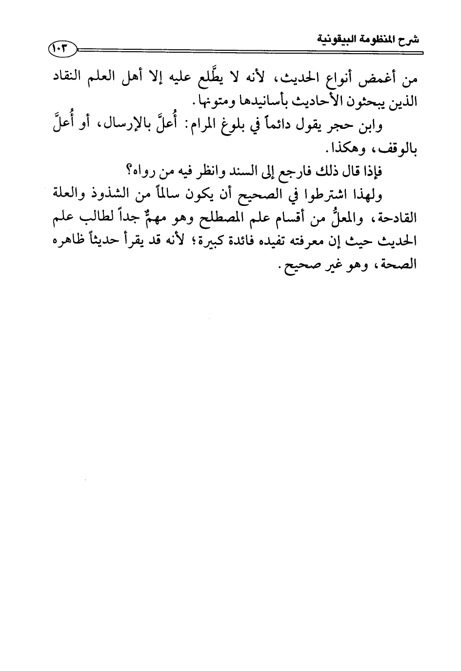 ولهذا اشترطوا في الصحيح أن يكون سالماً من الشذوذ والعلة القادحة، والمعلُّ من أقسام علم المصطلح وهو مهمٌّ جداً لطالب علم الحديث حيث إن معرفته تفيده فائدة كبيرة؛ لأنه قد يقرأ حديثاً ظاهره الصحة، وهو غير صحيح.
