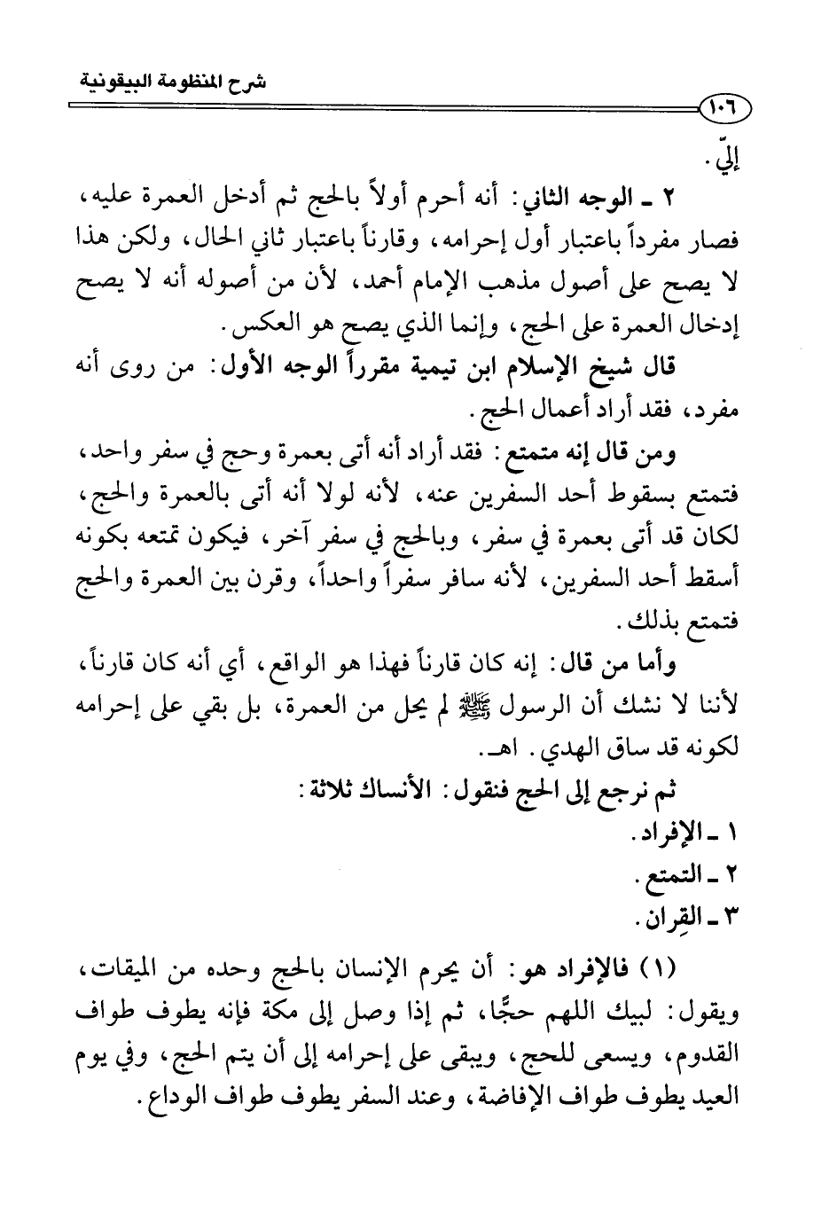 2 - الوجه الثاني: أنه أحرم أولاً بالحج ثم أدخل العمرة عليه، فصار مفرداً باعتبار أول إحرامه، وقارناً باعتبار ثاني الحال، ولكن هذا لا يصح على أصول مذهب الإمام أحمد، لأن من أصوله أنه لا يصح إدخال العمرة على الحج، وإنما الذي يصح هو العكس.