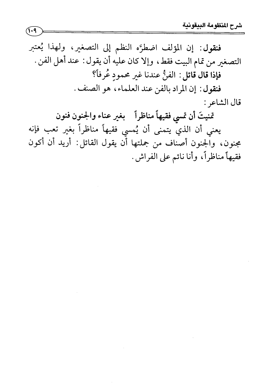 فنقول: إن المؤلف اضطرَّه النظم إلى التصغير، ولهذا يُعتبر التصغير من تمام البيت فقط، وإلا كان عليه أن يقول: عند أهل الفن.