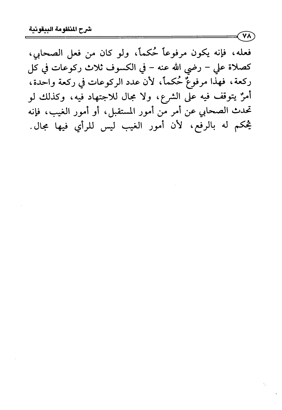 فعله، فإنه يكون مرفوعاً حُكماً، ولو كان من فعل الصحابي، كصلاة علي رضي الله عنه في الكسوف ثلاث ركوعات في كل ركعة، فهذا مرفوعٌ حُكماً، لأن عدد الركوعات في ركعة واحدة، أمرٌ يتوقف فيه على الشرع، ولا مجال للاجتهاد فيه، وكذلك لو تحدث الصحابي عن أمر من أمور المستقبل، أو أمور الغيب، فإنه يُحكم له بالرفع، لأن أمور الغيب ليس للرأي فيها مجال.