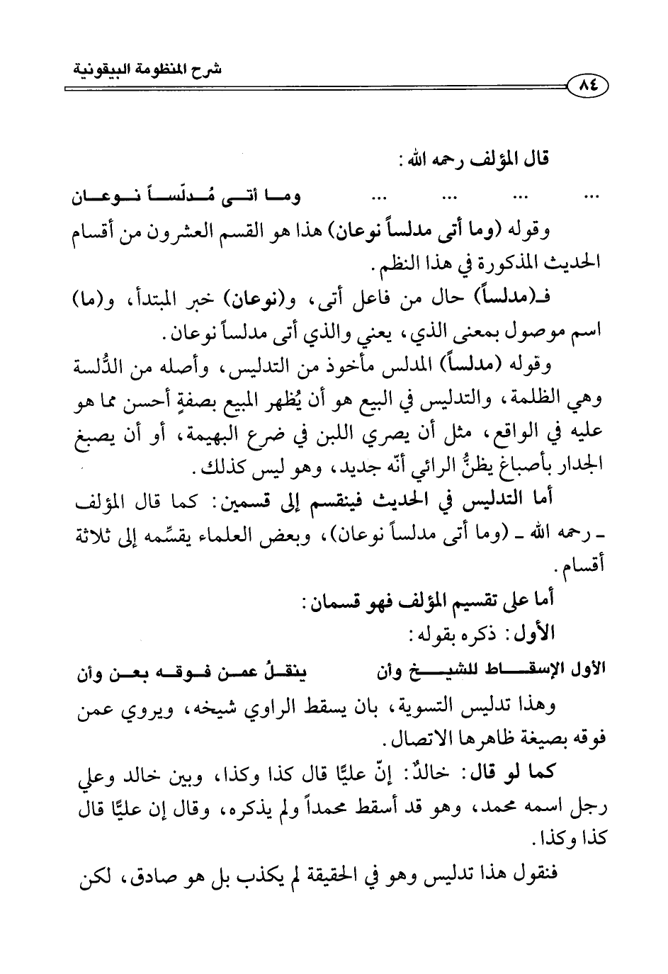 وقوله "وما أتى مدلساً نوعان" هذا هو القسم العشرون من أقسام الحديث المذكورة في هذا النظم.