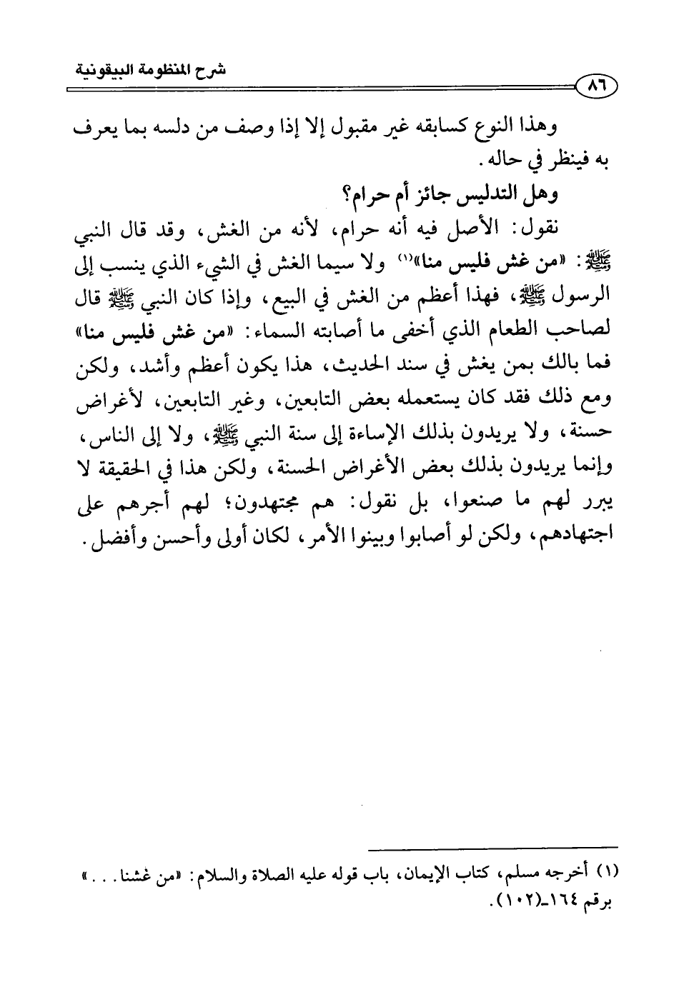 نقول: الأصل فيه أنه حرام، لأنه من الغش، وقد قال النبي صلى الله عليه وسلّم: "من غش فليس منا" 1 ولا سيما الغش في الشيء الذي ينسب إلى الرسول صلى الله عليه وسلّم، فهذا أعظم من الغش في البيع، وإذا كان النبي صلى الله عليه وسلّم قال لصاحب الطعام الذي أخفى ما أصابته السماء: "من غش فليس منا" فما بالك بمن يغش في سند الحديث، هذا يكون أعظم وأشد، ولكن ومع ذلك فقد كان يستعمله بعض التابعين، وغير التابعين، لأغراض حسنة، ولا يريدون بذلك الإساءة إلى سنة النبي صلى الله عليه وسلّم، ولا إلى الناس، وإنما يريدون بذلك بعض الأغراض الحسنة، ولكن هذا في الحقيقة لا يبرر لهم ما صنعوا، بل نقول: هم مجتهدون؛ لهم أجرهم على اجتهادهم، ولكن لو أصابوا وبينوا الأمر، لكان أولى وأحسن وأفضل.
