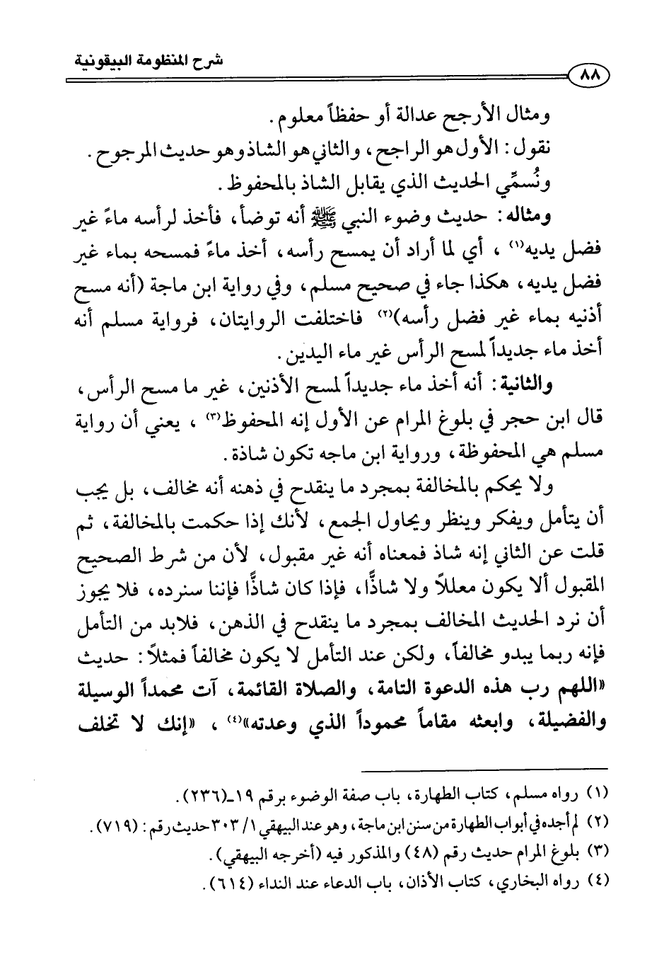 والثانية: أنه أخذ ماء جديداً لمسح الأذنين، غير ما مسح الرأس، قال ابن حجر في بلوغ المرام عن الأول إنه المحفوظ3، يعني أن رواية مسلم هي المحفوظة، ورواية ابن ماجه تكون شاذة.