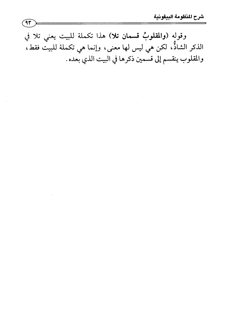 وقوله: "والمقلوبُ قسمان تلا" هذا تكملة للبيت يعني تلا في الذكر الشاذُّ، لكن هي ليس لها معنى، وإنما هي تكملة للبيت فقط، والمقلوب ينقسم إلى قسمين ذكرها في البيت الذي بعده.