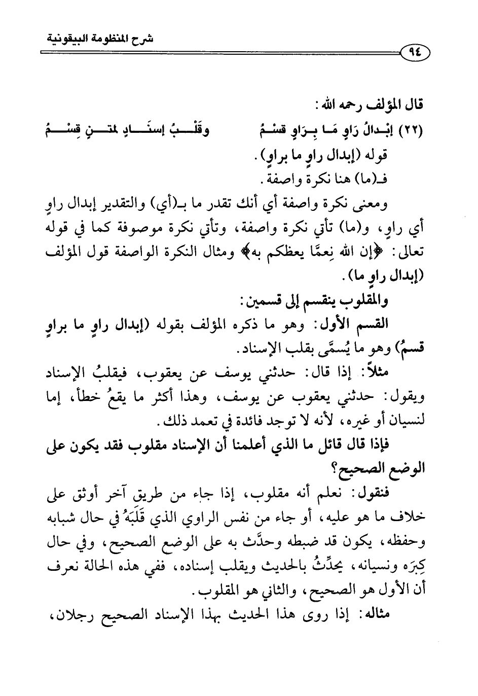 22 - إبْدالُ رَاوٍ مَا بِرَاوٍ قسْمُ ... وقَلْبُ إسنَادٍ لمتنٍ قِسْمُ