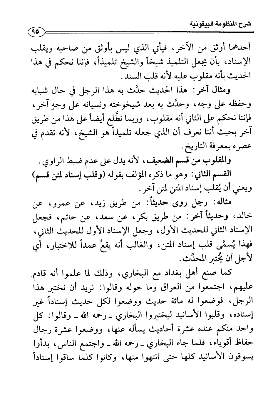 ومثال آخر: هذا الحديث حدَّث به هذا الرجل في حال شبابه وحفظه على وجه، وحدَّث به بعد شيخوخته ونسيانه على وجهٍ آخر، فإننا نحكم على الثاني أنه مقلوب، وربما نطَّلع أيضاً على هذا من طريق آخر بحيث أننا نعرف أن الذي جعله تلميذاً هو الشيخ، لأنه تقدم في عصره بمعرفة التاريخ.