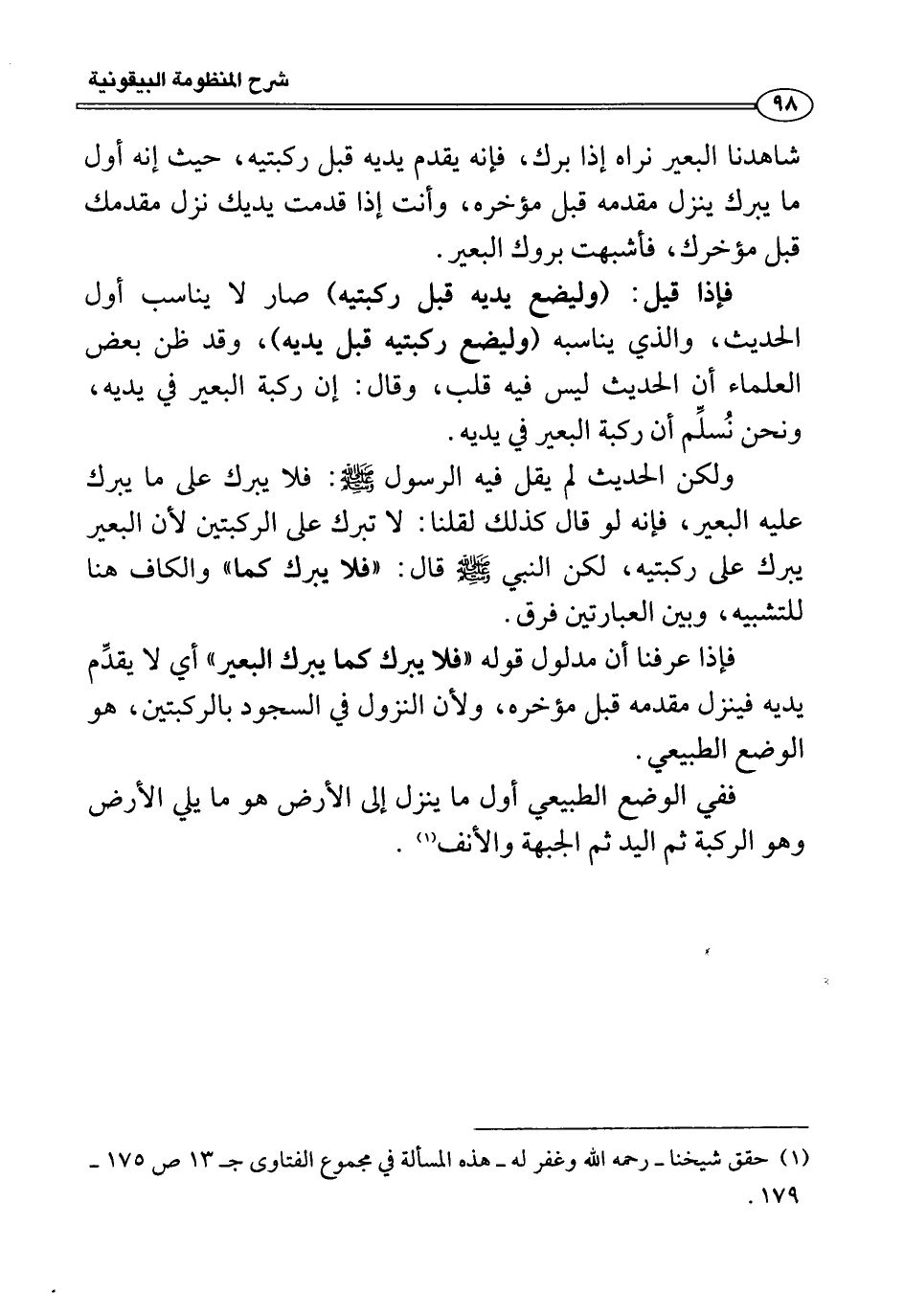 ولكن الحديث لم يقل فيه الرسول صلى الله عليه وسلّم: فلا يبرك على ما يبرك عليه البعير، فإنه لو قال كذلك لقلنا: لا تبرك على الركبتين لأن البعير يبرك على ركبتيه، لكن النبي صلى الله عليه وسلّم قال: "فلا يبرك كما" والكاف هنا للتشبيه، وبين العبارتين فرق.