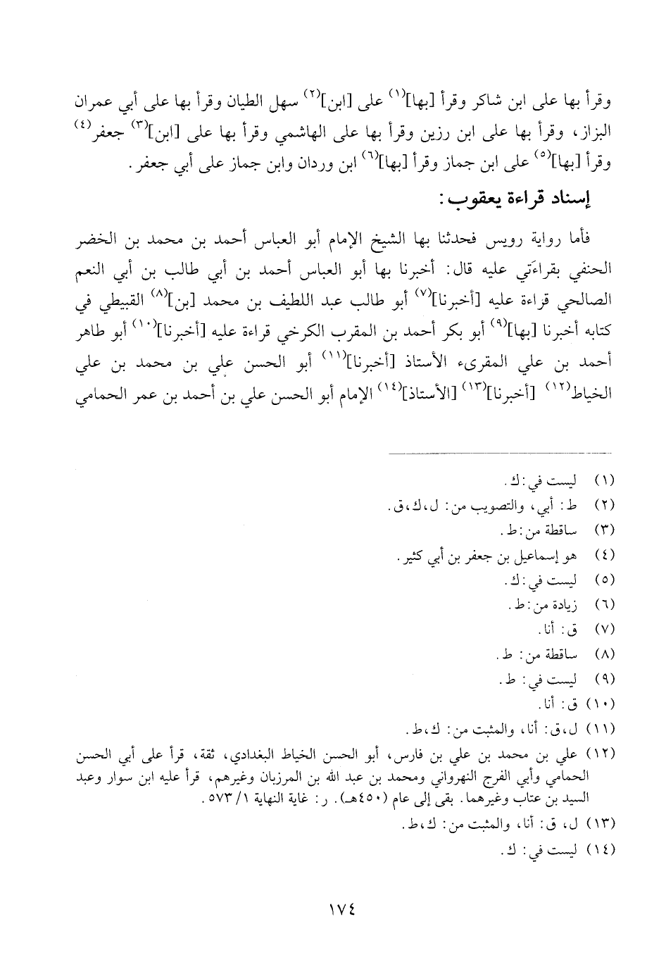 قَرَأَ عَاصِم وَالْكسَائِيّ وَيَعْقُوب وَخلف: (وَمَالك يَوْم الدّين) بِالْألف وَالْبَاقُونَ بِغَيْر ألف [وَخلف عَن حَمْزَة] : الصِّرَاط وصراط حَيْثُ وَقعا بإشمام الصَّاد [الزَّاي] وخلاد بإشمامها الزَّاي فِي قَوْله تَعَالَى: {الصِّرَاط الْمُسْتَقيم} [هُنَا] خَاصَّة، وقنبل ورويس: بِالسِّين حَيْثُ وَقعا، وَالْبَاقُونَ بالصَّاد حَمْزَة عَلَيْهِم وإليهم ولديهم بِضَم الْهَاء قلت: وَافقه يَعْقُوب فِي ذَلِك وَزَاد ضم كل هَاء ضمير جمع أَو تَثْنِيَة وَقعت بعد ياو سَاكِنة نَحْو /: عَلَيْهِمَا [وَعَلَيْهِم]