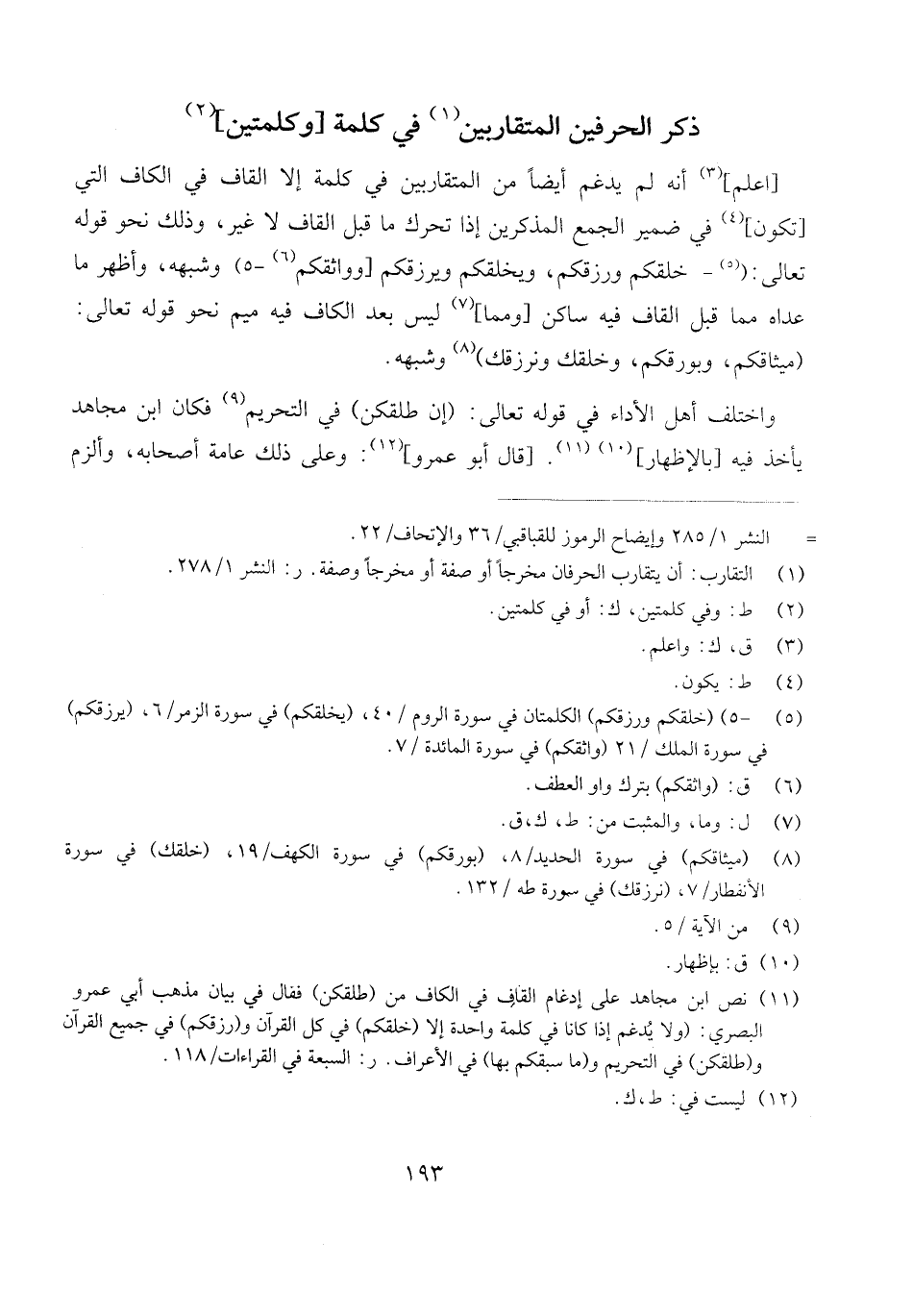 : وَاعْلَم أَن اليزيدي حكى عَن أبي عَمْرو أَنه أدغم كَانَ إِذا الْحَرْف الأول من الحرفين فِي مثله [أَو مقاربة] وَسَوَاء سكن مَا قبلهَا أَو تحرّك وَكَانَ مخفوضا أَو مَرْفُوعا أَشَارَ إِلَى حركته تِلْكَ دلَالَة عَلَيْهَا [مِنْهُ] وَالْإِشَارَة تكون روما وإشماما وَالروم آكِد لما فِيهِ من الْبَيَان عَن كَيْفيَّة الْحَرَكَة غير أَن الْإِدْغَام الصَّحِيح يمْتَنع مَعَه وَيصِح مَعَ الإشمام، [والإشمام] فِي المخفوض مُمْتَنع (7 - لبعد ذَلِك الْعُضْو عَن مخرج الْخَفْض) [فَإِن] كَانَ الْحَرْف الأول مَنْصُوبًا لم يشر إِلَى حركته لخفتها وَكَذَلِكَ لَا يُشِير إِلَى الْحَرَكَة فِي الْمِيم إِذا لقِيت [مثلهَا] أَو بَاء، وَفِي الْبَاء إِذا لقِيت مثلهَا أَو ميما بِأَيّ حَرَكَة تحرّك ذَلِك لِأَن الْإِشَارَة تتعذر فِي ذَلِك من أجل انطباق الشفتين وَبِاللَّهِ التَّوْفِيق.