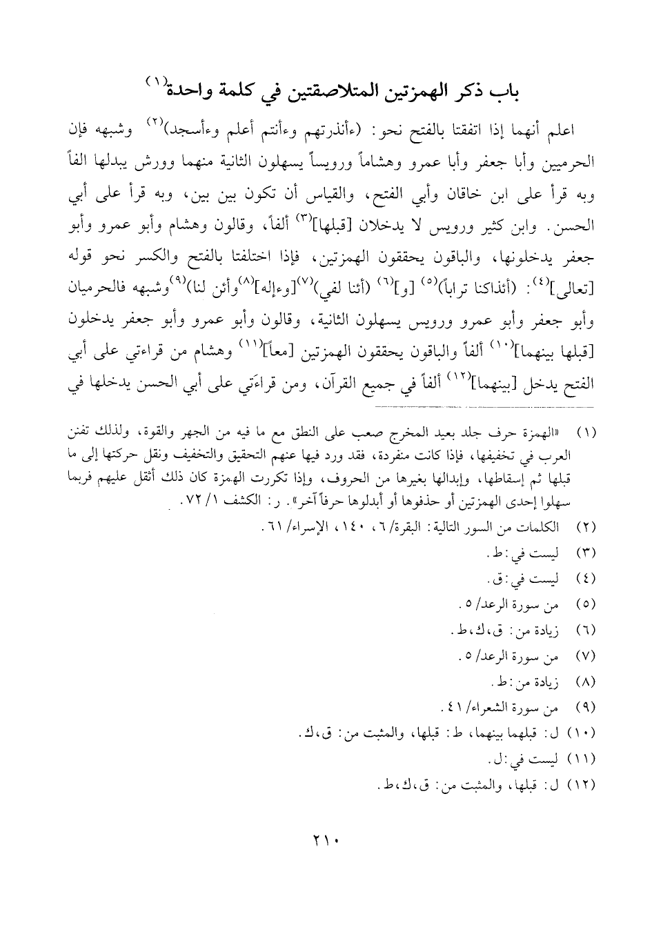 [كسرة] يَاء من (ليبطئن) . (- ورئاء وقرىء وَلَقَد استهزىء ولنبوئنهم [وَفِئَة وَمِائَة] [كَيفَ وَقعا] وملئت وخاطئة [والخاطئة] [وناشئة وشانئك] وخاسئا وَاخْتلف عَنهُ فِي (موطئا) وَكَذَلِكَ يحذف الْهمزَة المضمومة إِذا وَقعت بعد كسرة وَكَانَ بعْدهَا وَاو نَحْو: (يستهزؤن [ومستهزؤون] وأنبئوني وليطفئوا وليواطئوا) وَقد اسْتثْنِي لِابْنِ وردان حرف وَاحِد وَهُوَ: (المنشئون) على خلاف بَين أهل الْأَدَاء، وَإِذا حذف [الْهَمْز] من ذَلِك ضم مَا قبل الْوَاو وَكَذَلِكَ يحذف الْهمزَة من (يطئون [وتطئوهم] [وَلم تطئوها] حَيْثُ وَقع [وَكَذَلِكَ] يُبدل الْهمزَة من