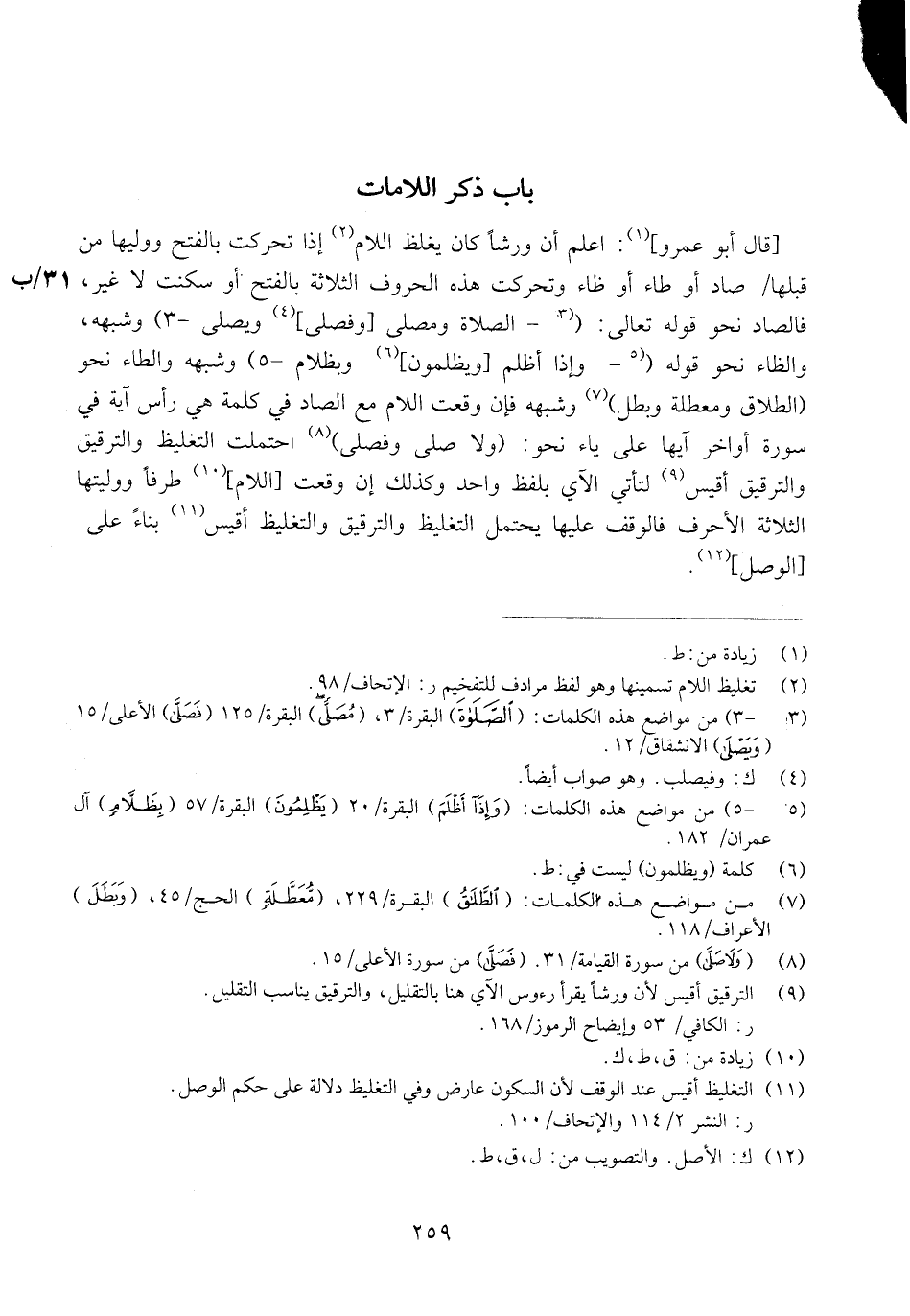 وكل يَاء بعْدهَا همزَة مَكْسُورَة نَحْو قَوْله تَعَالَى: (مني إِلَّا ومني إِنَّك ويدي إِلَيْك وربي إِلَى صِرَاط) وَشبهه فنافع وَأَبُو عَمْرو وَأَبُو جَعْفَر يفتحونها فِي جَمِيع الْقُرْآن وَتفرد [أَبُو جَعْفَر وَنَافِع دونه] بِفَتْح ثَمَانِيَة مَوَاضِع فِي آل عمرَان والصف {من أَنْصَارِي إِلَى اللَّهِ} وَفِي الْحجر (بَنَاتِي إِن كُنْتُم) وَفِي الْكَهْف والقصص وَالصَّافَّات (ستجدني إِن شَاءَ اللَّهِ) وَفِي الشُّعَرَاء (بعبادي إِنَّكُم) وَفِي ص. (لَعْنَتِي إِلَى) وَزَاد ورش عَنهُ