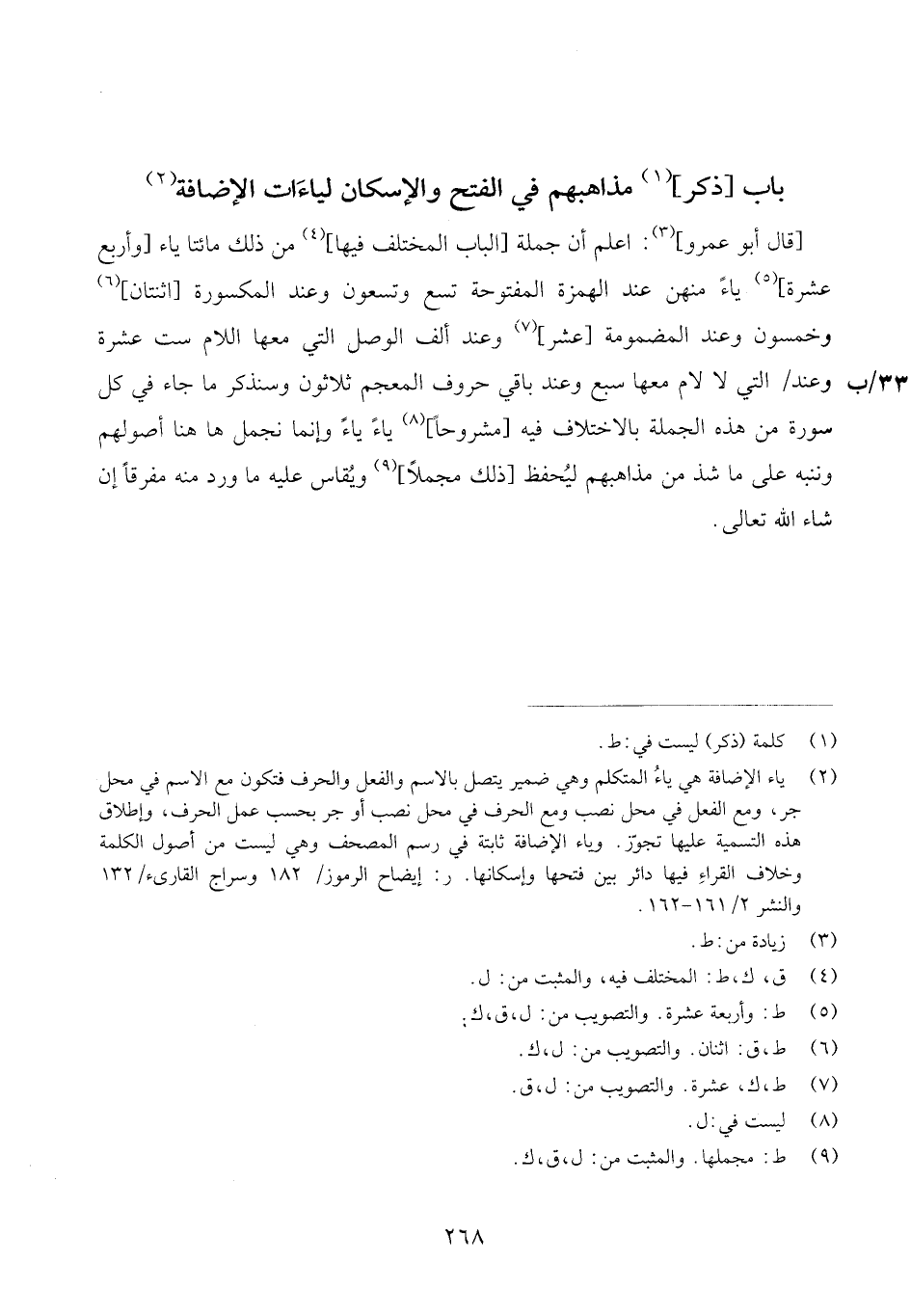 [وحذفهن كُلهنَّ عَاصِم فِي الْحَالين وَاخْتلف عَنهُ فِي ياءين [إِحْدَاهمَا] فِي النَّمْل {فَمَا أَتَانِي اللَّهِ خير} فتحهَا حَفْص فِي الْوَصْل وأثبتها سَاكِنة فِي الْوَقْف وحذفها أَبُو بكر فِي الْحَالين، وَالثَّانيَِة فِي الزخرف {يَا عبَادي لَا خوف عَلَيْكُم الْيَوْم وَلَا أَنْتُم تَحْزَنُونَ} فتحهَا أَبُو بكر فِي الْوَصْل وأثبتها سَاكِنة فِي الْوَقْف، وحذفها حَفْص فِي الْحَالين وَأثبت ابْن عَامر فِي رِوَايَة هِشَام الْيَاء فِي الْحَالين فِي قَوْله تَعَالَى: (ثمَّ
