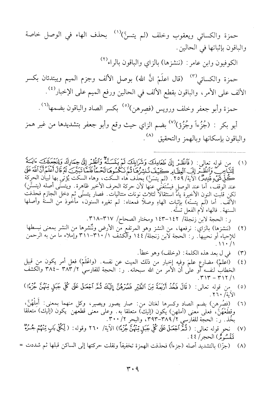 أَبُو بكر: (وكفلها زَكَرِيَّاء) بِنصب الْهمزَة، وَحَفْص [وَحَمْزَة] وَالْكسَائِيّ وَخلف يتركون إِعْرَاب زَكَرِيَّا وهمزة هُنَا وَفِي سَائِر الْقُرْآن، وَالْبَاقُونَ يرفعون الْهمزَة هُنَا. ويعربونه ويهمزونه حَيْثُ وَقع، فَإِن لَقِي همزَة حققها أَبُو بكر وَابْن عَامر وروح وسهلها الحرميان وَأَبُو عَمْرو وَأَبُو جَعْفَر ورويس.
