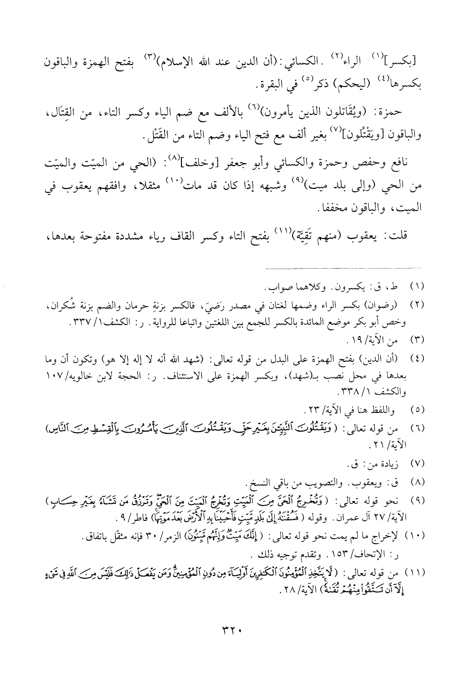 حَمْزَة وَالْكسَائِيّ وَخلف: (وَقتلُوا وقاتلوا) وَفِي التَّوْبَة (فيقتلون وَيقْتلُونَ) يبدءون بالمفعول قبل الْفَاعِل فيهمَا، وَالْبَاقُونَ يبدءون بالفاعل قبل الْمَفْعُول.
