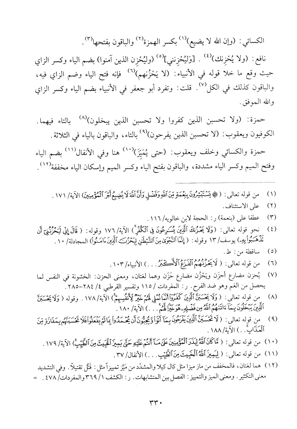 نَافِع وَابْن عَامر وَالْكسَائِيّ وَأَبُو جَعْفَر وَخلف (غير أولى الضَّرَر) بِنصب الرَّاء وَالْبَاقُونَ برفعها.
