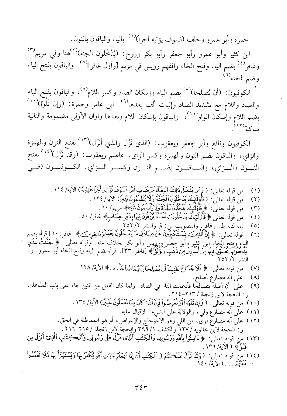 ابْن عَامر وَأَبُو جَعْفَر ورويس (فتحنا عَلَيْهِم) هُنَا وَفِي الْأَعْرَاف وَالْقَمَر (وَفتحت) فِي الْأَنْبِيَاء بتَشْديد التَّاء فِي الْأَرْبَعَة، وافقهم روح فِي الْقَمَر والأنبياء وَالْبَاقُونَ بتخفيفها. ابْن عَامر (بالغدوة) هُنَا وَفِي الْكَهْف بِالْوَاو وَضم الْغَيْن وَالْبَاقُونَ بِفَتْح الْغَيْن وَالْألف. عَاصِم وَابْن عَامر وَيَعْقُوب (أَنه من عمل مِنْكُم فَأَنَّهُ غَفُور رَحِيم) بِفَتْح الهمزتين وَنَافِع وَأَبُو جَعْفَر بِفَتْح / الأولى فَقَط وَالْبَاقُونَ بكسرهما.