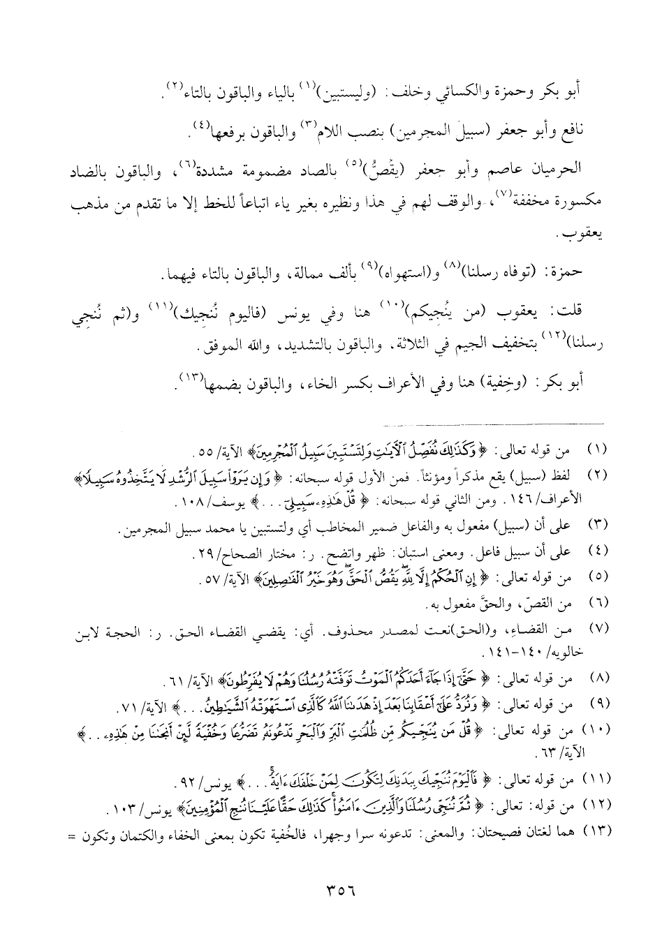 (رَبِّي إِلَى صِرَاط مُسْتَقِيم) فتحهَا نَافِع وَأَبُو جَعْفَر وَأَبُو عَمْرو. (ومحياي) سكنها أَبُو جَعْفَر وَنَافِع بِخِلَاف عَن ورش.